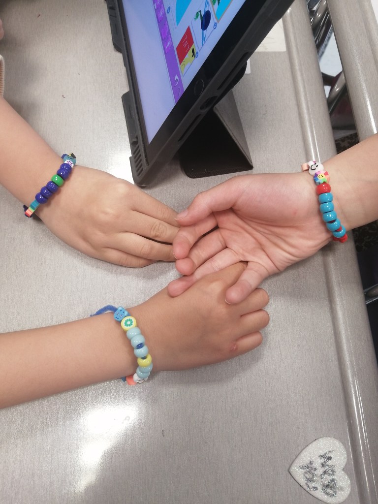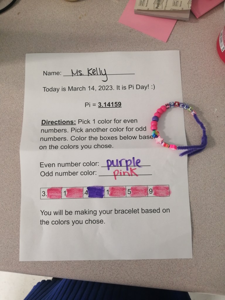 Anyways, I used the number: 3.14159 as my Pi number to keep it simple and short for my students. My students get to choose a color for odd numbers and another color for even numbers. If the number in Pi is odd, they will add that colored bead to their bracelet (using a pipe cleaner as the bracelet). If the number in Pi is even, they will add the other colored bead to their bracelet. The bracelet symbolizes the math and coding patterns in Pi, such as big concept in computer science education and math is recognizing patterns. Below are some pictures: