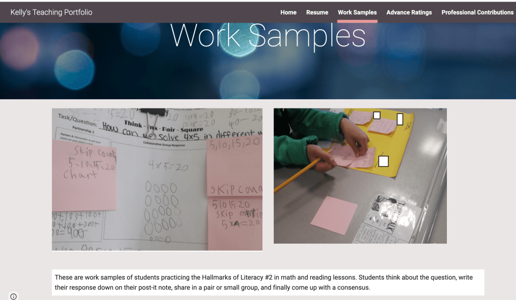 Including work samples of your lesson plans, students’ work, group projects, rubrics or exams you’ve created, etc. will definitely help you stand out! Many times, hiring teams find that teachers typically have similar resumes, such as college, graduate school, certifications, etc. However, your turn to shine is really in the work samples. Include pictures of group projects you’ve done with the students, outstanding students’ work (such as dioramas, posters, published writings, etc.), and anything you created that is not easily found on Google or Teachers Pay Teachers. I do not recommend putting students’ tests with their scores (like a multiple-choice exam) in your portfolio! However, you can put a student’s reading project with a rubric attached. Make sure you blur or remove the student’s name to protect confidentiality. I’ve attached pictures of my students’ group work in using the speaking and listening protocols for an essential unit question in reading to my portfolio on Google Sites and I was given compliments on it.